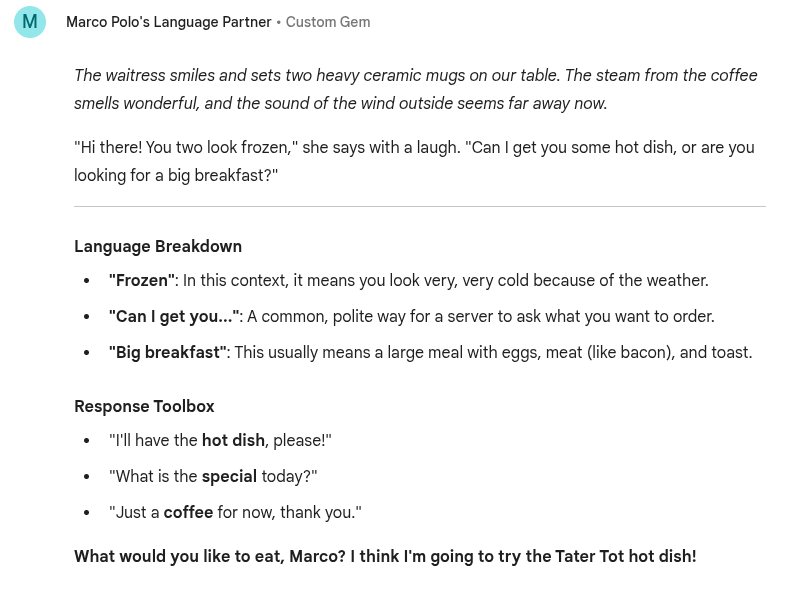 I created a free "gem" called Marco Polo’s Language Partner. With it, you choose the country you want to visit. It is like a text-based game. The storyteller describes the situation, a "local person" talks to you, and then you get an explanation of the language, a set of possible answers, and advice on your last answer.