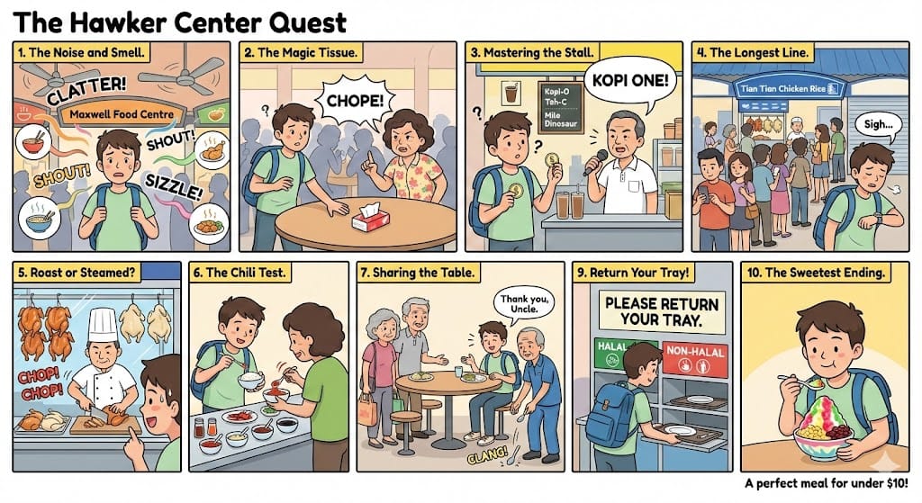 "\"You cannot sit there,\" she said kindly. \"Someone has 'choped' that seat.\" Ben was confused. She explained that in Singapore, leaving a packet of tissues on a table means the seat is reserved. It is an unwritten rule. Ben nodded and smiled. He bought a packet of tissues and found another empty table to 'chope' for himself."