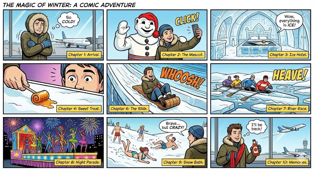 "He had learned new words like \"tuque\" and \"depanneur.\" He had tasted maple taffy and seen an ice hotel. Canada was cold, but the people were warm and friendly. \"I will come back next year,\" Leo promised himself as he headed to the airport."